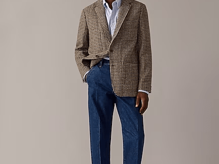 The reason I discourage overly slim or skinny jeans isn’t because they’re officially “out of trend” these days. It’s because proportionally, they can look really awkward with a sport coat, especially a proper, full-bodied one.