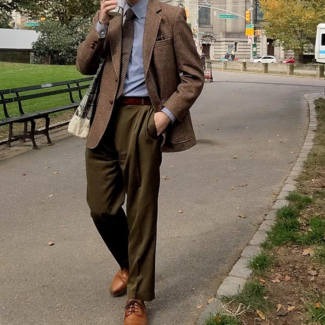 Want to teeter on sharp-but-still-totally-casual? Dress pants (with pleats!) work great – but make sure the fabrics of the pants and jacket contrast. Otherwise, it can give off the impression that you’re wearing a false suit of sorts. Not a good look. Like, at all. A good way to avoid this is to wear two pieces that are each composed of complimentary fabrics and colors. Disregard the tie/dress shirt combo I’m sporting below and note how this brown tweed pairs nicely with the smooth green wool trousers. Add some knitwear or a denim shirt and you’ve got a smart casual fit that just works.