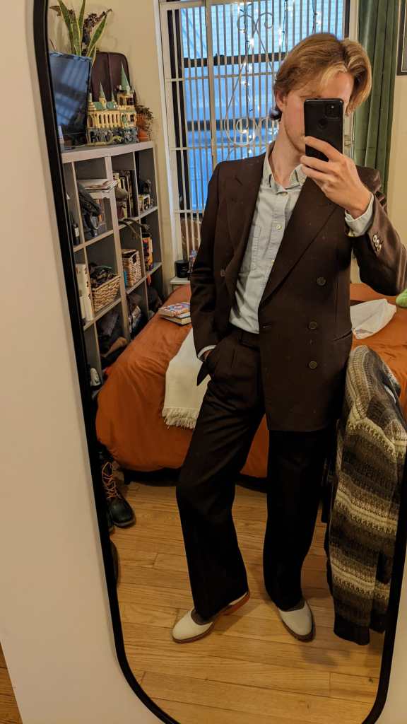As you can see, I had a bit of a field day trying to build a full outfit. I paired the suit with a thrifted blue-and-white striped, contrast collar shirt, a vintage Christian Dior tie, and saddle shoes I’d been given by my godfather. Looking back, the pants could absolutely use a hem, and the shirt was admittedly a bit more 80s than the rest of the ensemble. All-in-all, it was a fairly silly look. But a fun one! And it started me down a new niche rabbit hole of vintage fashion.