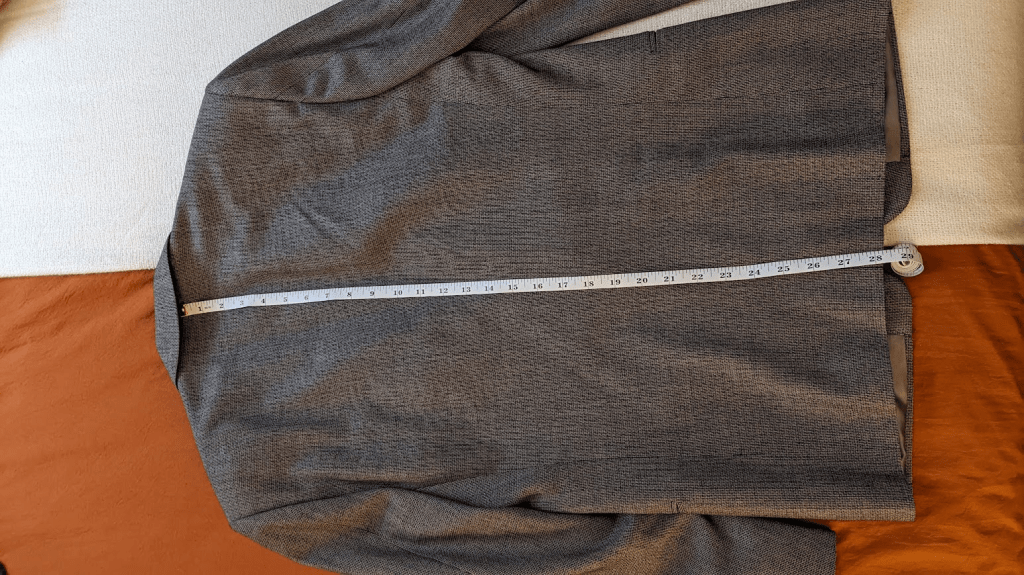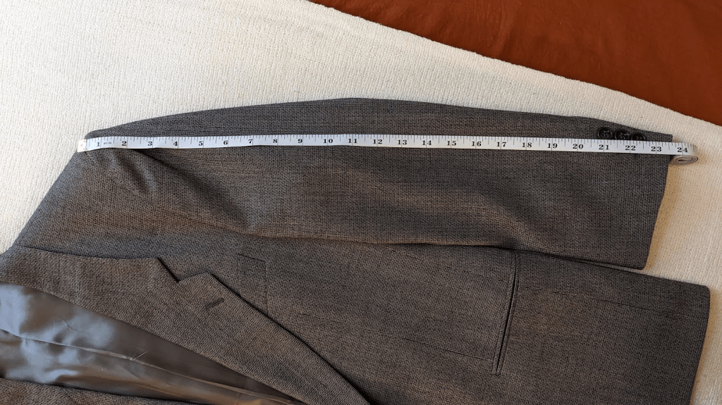 Shoulder to sleeve: Measures between the shoulder seam and the end of the sleeve (duh). Generally, you want a jacket sleeve to extend ever so slightly past your wrist, but not so long that it fully covers your shirt sleeve. The good news is, that it’s not too tricky to get a sleeve shortened, provided there aren’t any fully functioning buttons. In terms of lengthening, you can basically do as much as the fabric available within the cuff will allow. Good tailoring provides a couple of inches, typically. But if the jacket is used/vintage, there’s a chance it’s already been used up for an extension, so make sure this works for you.