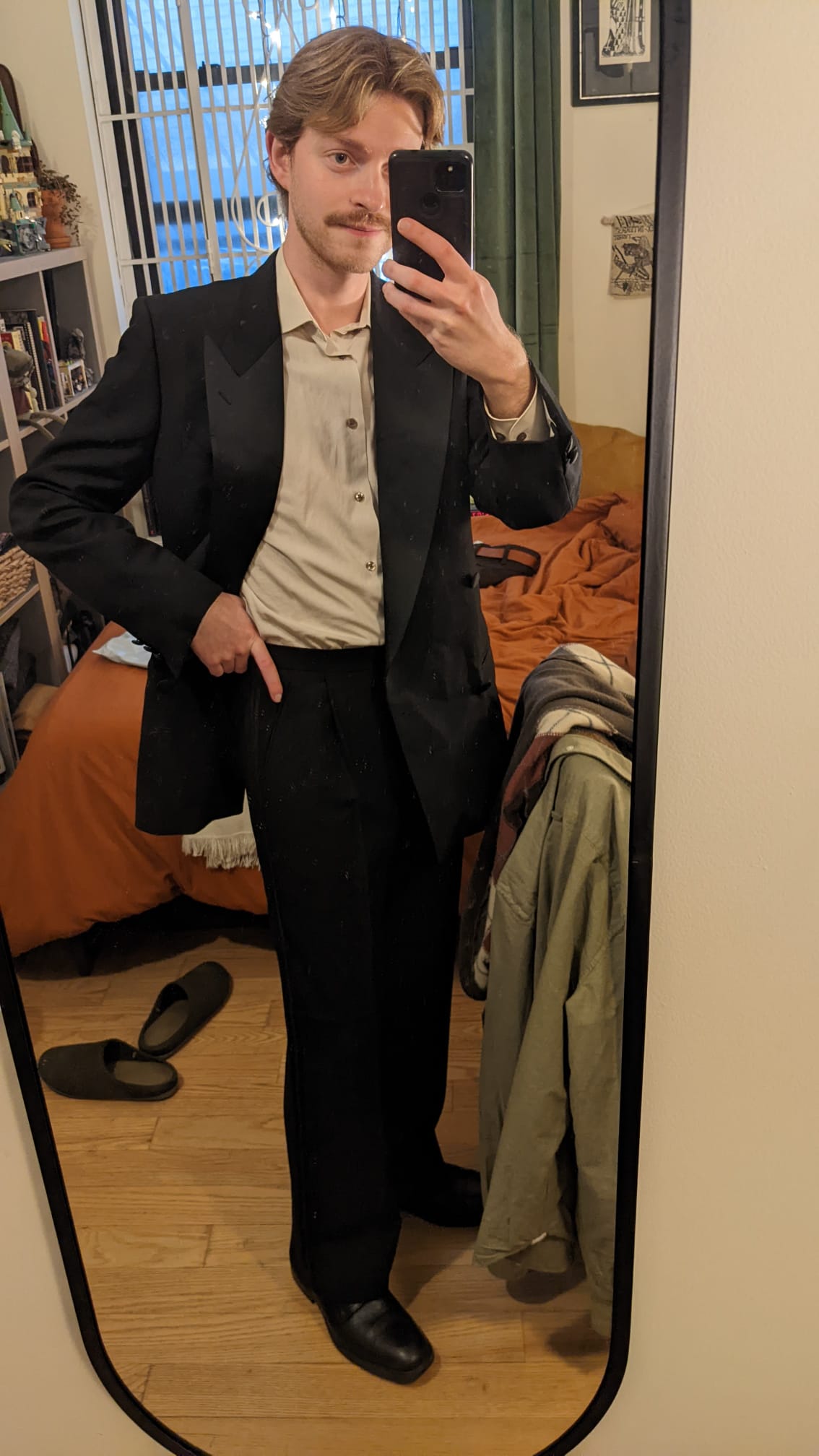 One thing to note is that, for as much as I love this tux, the pants are mid-rise at best (Uggghghgh I sound like such a menswear freak lol). I wish they came up just a bit higher. While yes, when the jacket is worn closed as intended, you can only see the top few studs, there is one lone singular plastic button that rest just above the waistline that I wish was covered. It’s not a big deal since no one else will see it once the outfit is worn properly, but as a wannabe perfectionist, I know it will slowly drive me absolutely batty. Lmao.