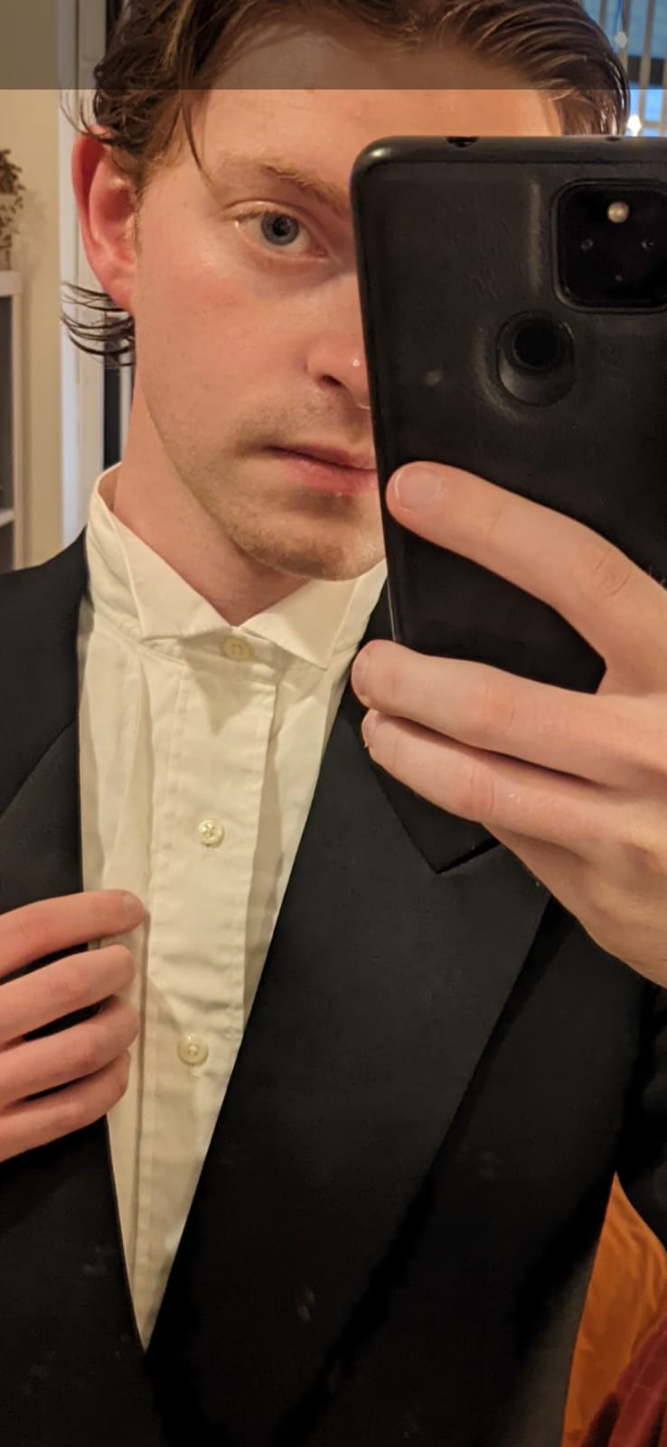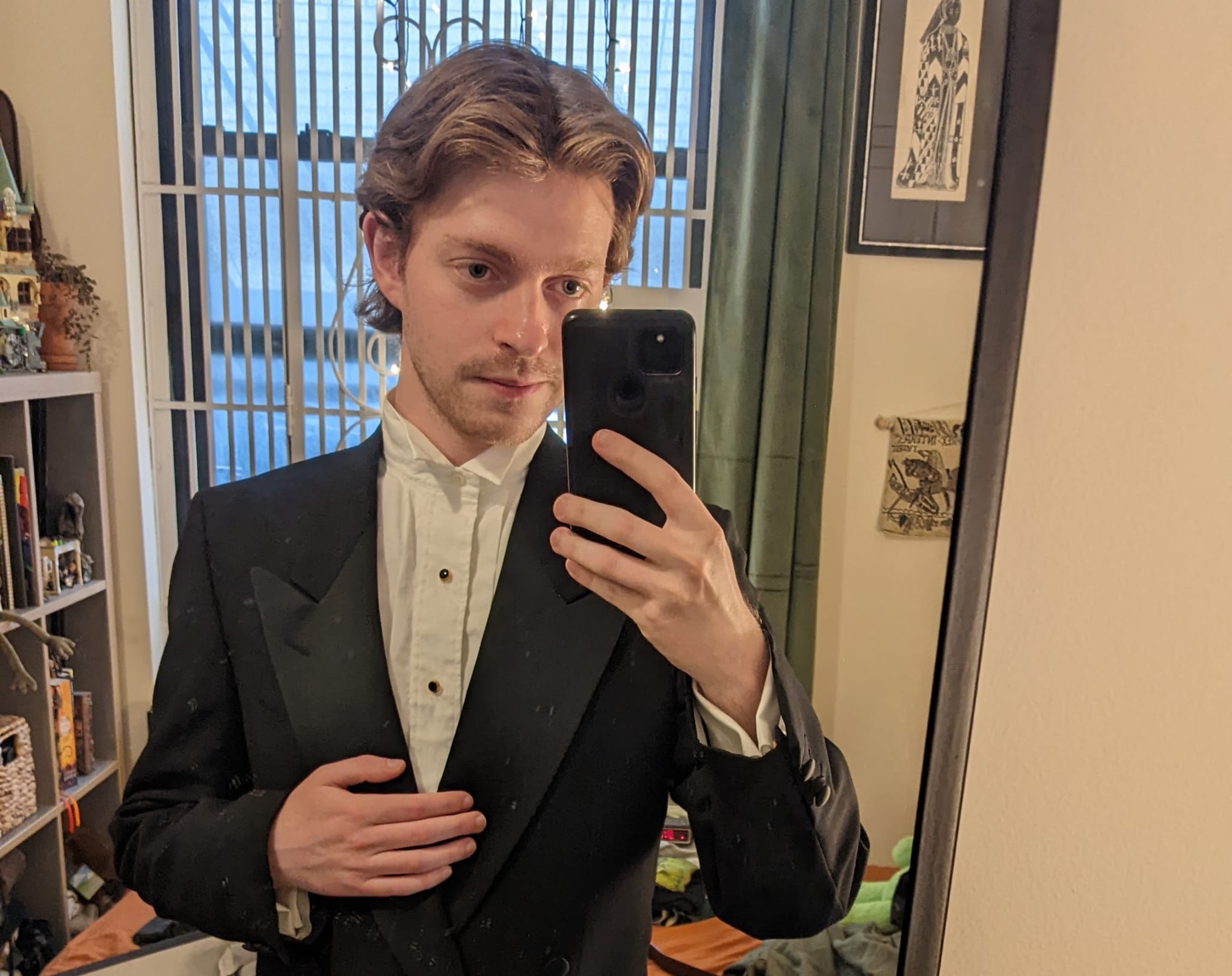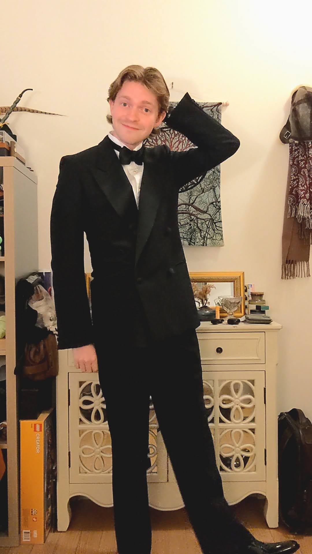 I’m also really glad I chose to go with a wing collar. I think it looks so neat! I did have to practice tying the bow tie for longer than I care to admit, however. I think I more or less got a decent result by the end (it is totally being squashed by my lapel in the pic below, though, lol).