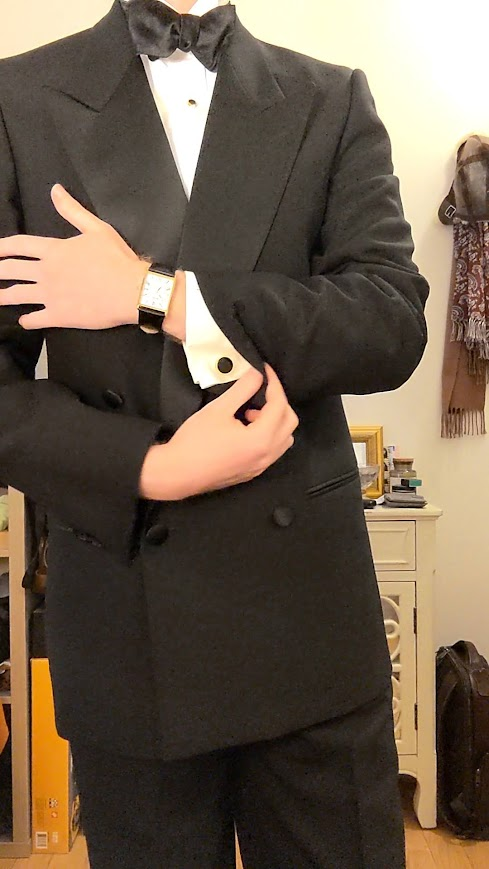 The thing is, I often unbutton my DB jackets when sitting down – though this is usually when wearing casual looks with more casual DB suits. I’m not opposed to doing it for fine wool business suits either, but I suppose that when going black tie, I can learn to change this habit. It’s totally possible to sit with a DB closed, I’m just not accustomed to it. And so, I’ll learn to be.