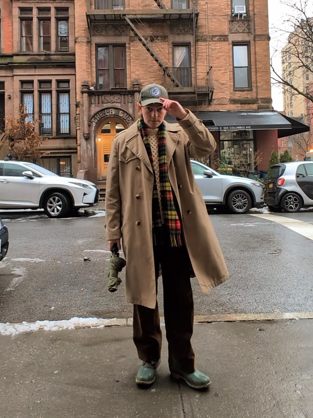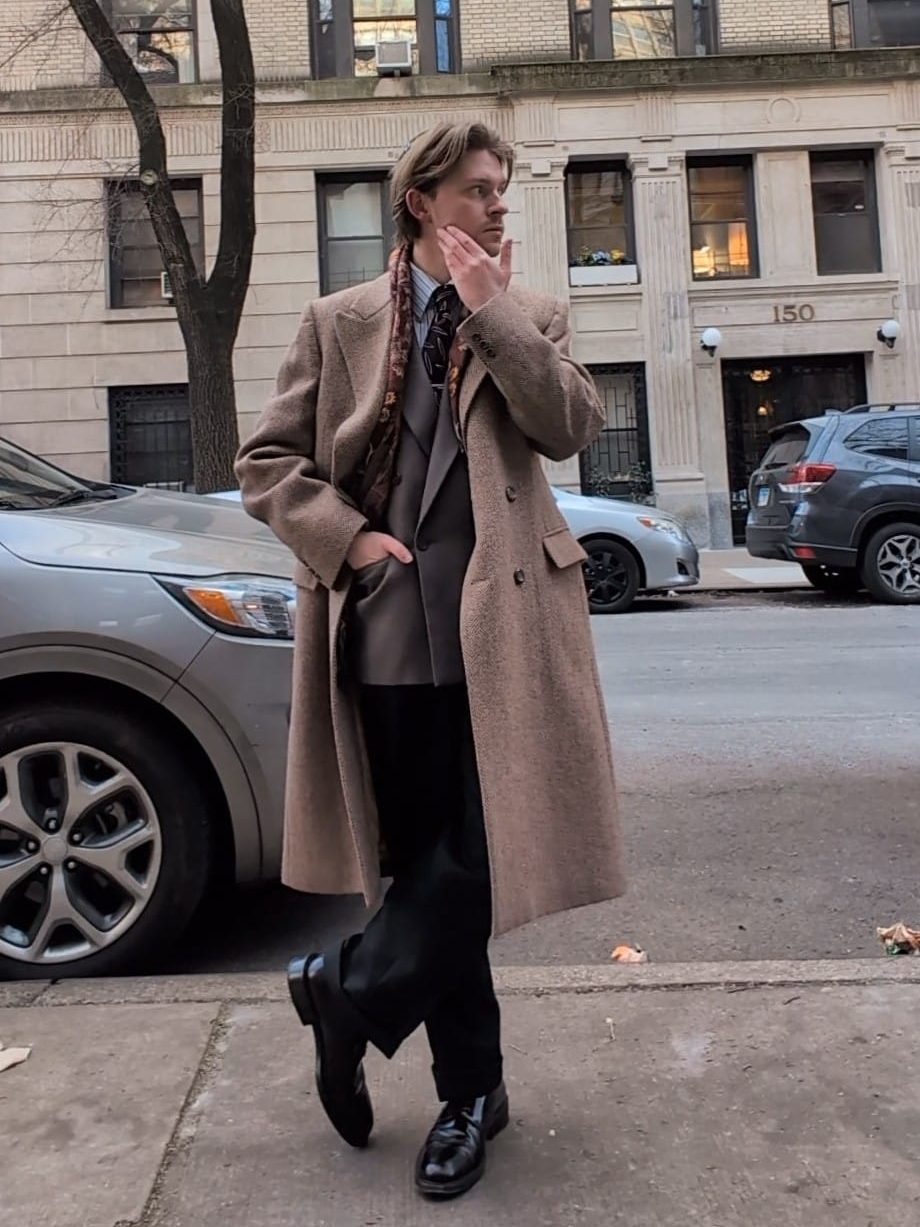 The overcoat, arguably the most dramatic piece, was something I picked up at my local neighborhood flea market, The Grand Bazaar, for around $60. It’s from a label called The American Male, and is one of my favorite pieces of outerwear. It’s double-breasted, a light-brown/tan herringbone pattern, and even has a belted back. Banger.
