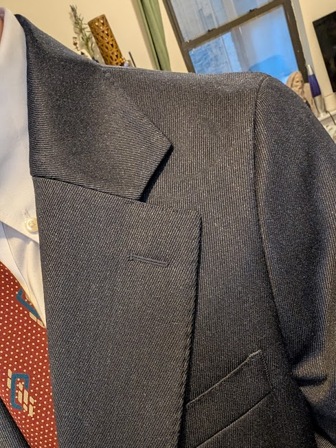 This suit checks all my boxes. It’s solid navy, of course, but made from a cavalry twill wool fabric, which gives it a slightly more interesting texture than your standard worsted wool.