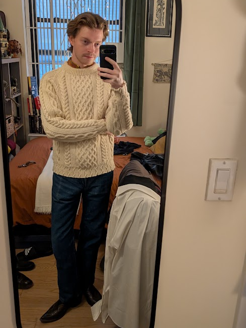 Lastly, I scored this classic Irish Aran knit (aka an Irish fisherman’s sweater) at a local thrift store earlier this week. I actually already have one that’s very similar, which I got last winter, but this new one fit too well at too good a price for me not to purchase.